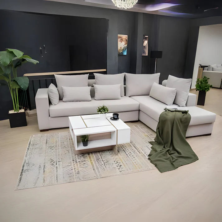 A modern corner sofa with a comfortable and elegant design, ideal for utilizing spaces and achieving maximum comfort. Made of high-quality materials and comes in colors that suit different decors. The perfect choice to add a touch of luxury to your living room