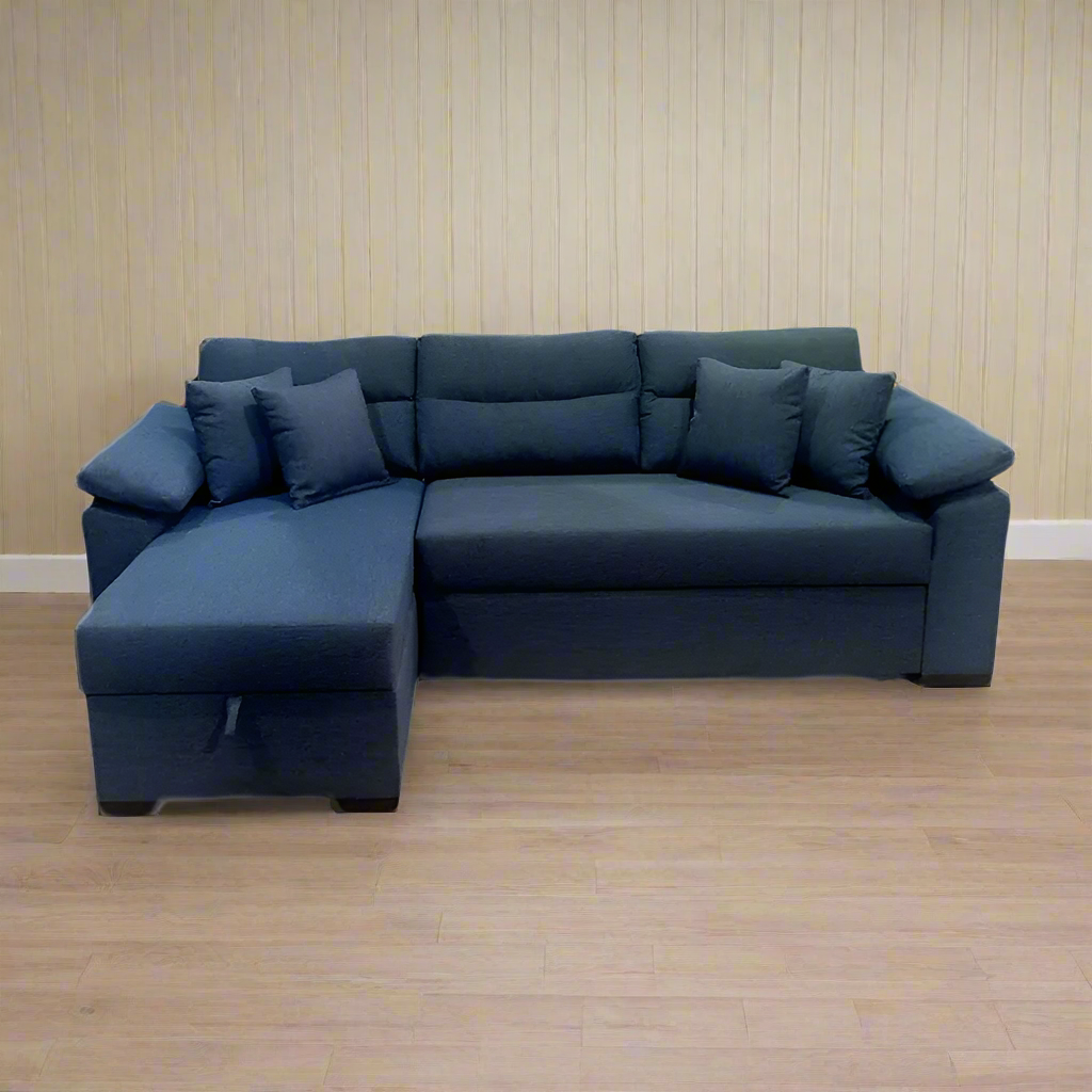 A stylish, multi-purpose corner sofa with a modern design, equipped with a mechanism to transform it into a comfortable bed and a drawer for storing items, combining comfort and innovation to fit any space.