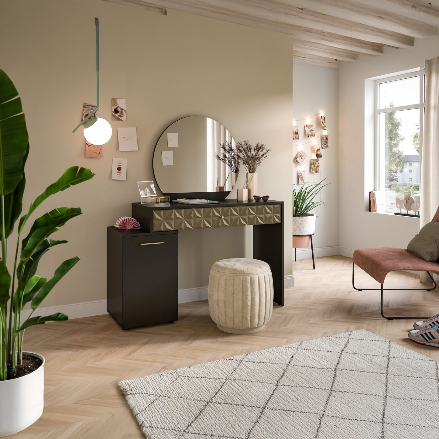 A stunning dresser with a modern design that matches all decor styles. It provides you with ample space to store and organize your personal items with elegance and comfort. A perfect addition to your bedroom, combining beauty and practicality in one piece.