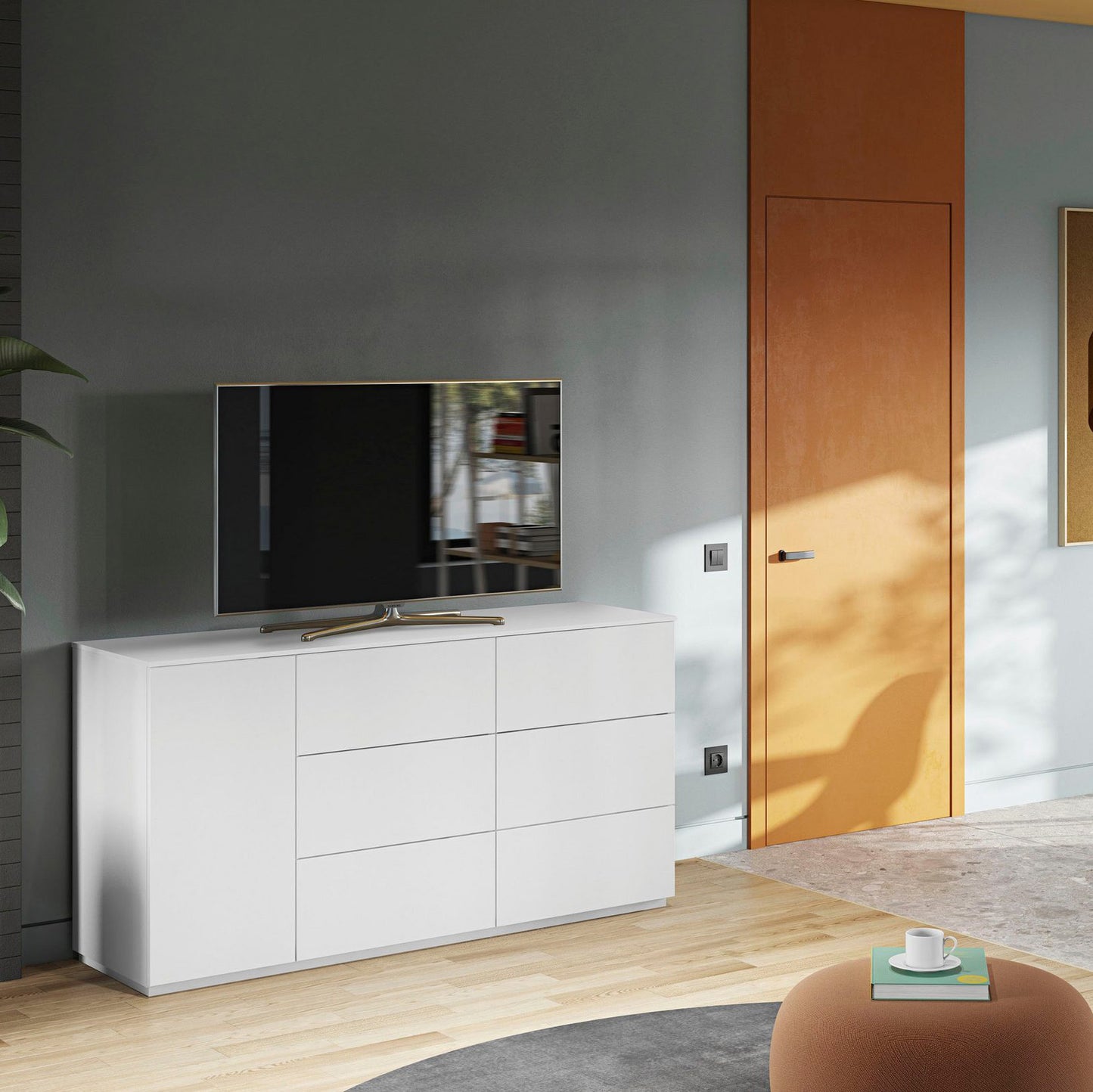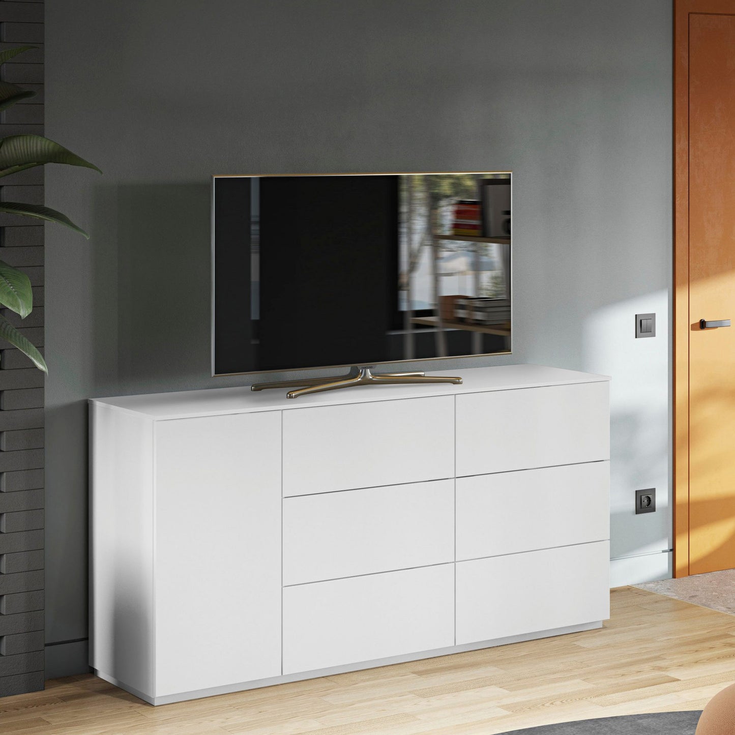 An elegant TV table with a modern design that combines practicality and beauty, equipped with ideal storage spaces for organizing devices and accessories, to add a touch of elegance and perfect organization to the living room.