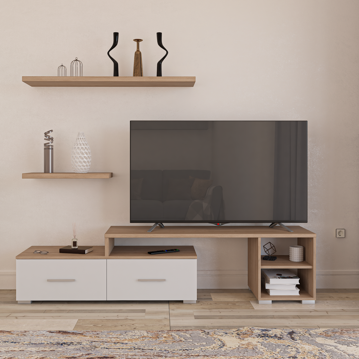Stylish TV table with wall shelves adds a modern touch and perfect organization to the living room. Provides space to arrange devices and decorations in a coordinated and attractive way. A design that combines beauty and functionality for perfect integration.
