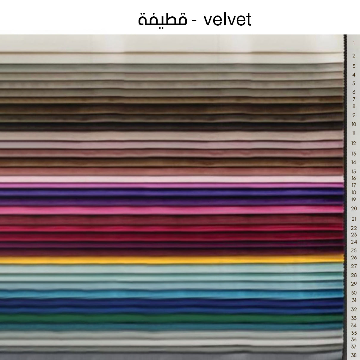 - الخامات: خشب زان طبيعي - القماش متاح قطيفة أو كتان أو جلد مقلوب