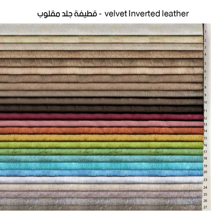 - الخامات: خشب زان طبيعي - القماش متاح قطيفة أو كتان أو جلد مقلوب