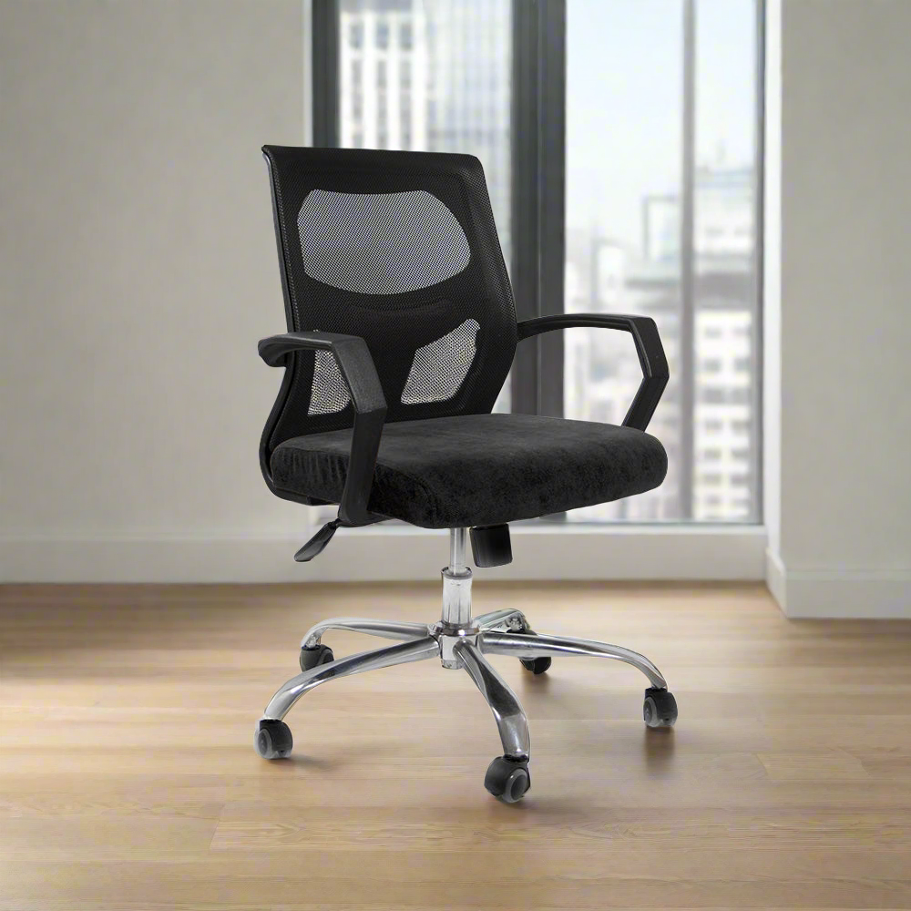 كرسي متحرك يجمع بين الراحة الذى تحتاج اليها وبين المظهر الانيق قابل للدوران، مصنوع من الشبك القابل لتغيير اللون ومزود بمكاينزم لرفع وخفض الكرسي ليمكنك من الجلوس بشكل مريح، به دعامه للفقرات القطنية مثبت علي نجمة من المعدن او البلاستيك يمكنك الاختيار بينهم