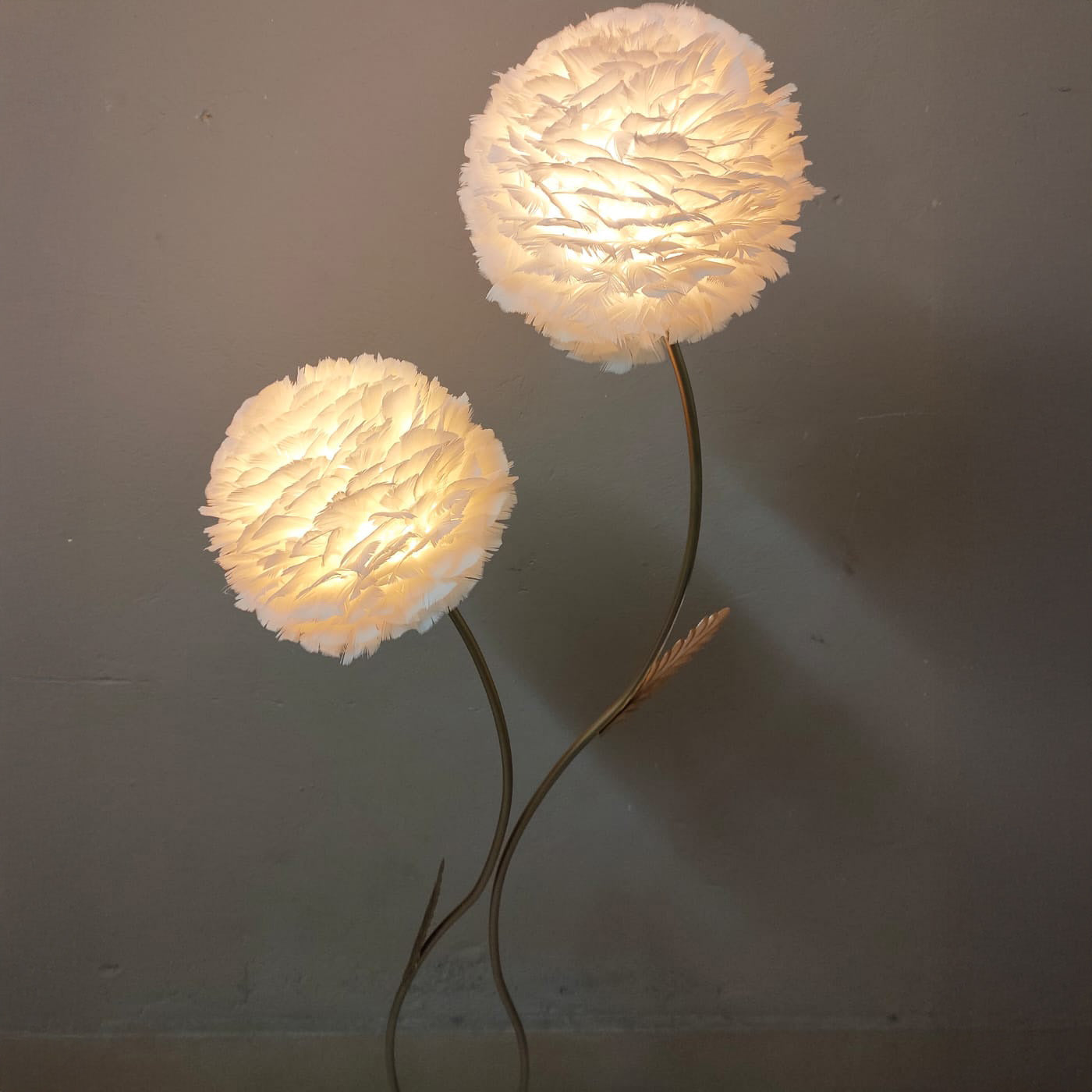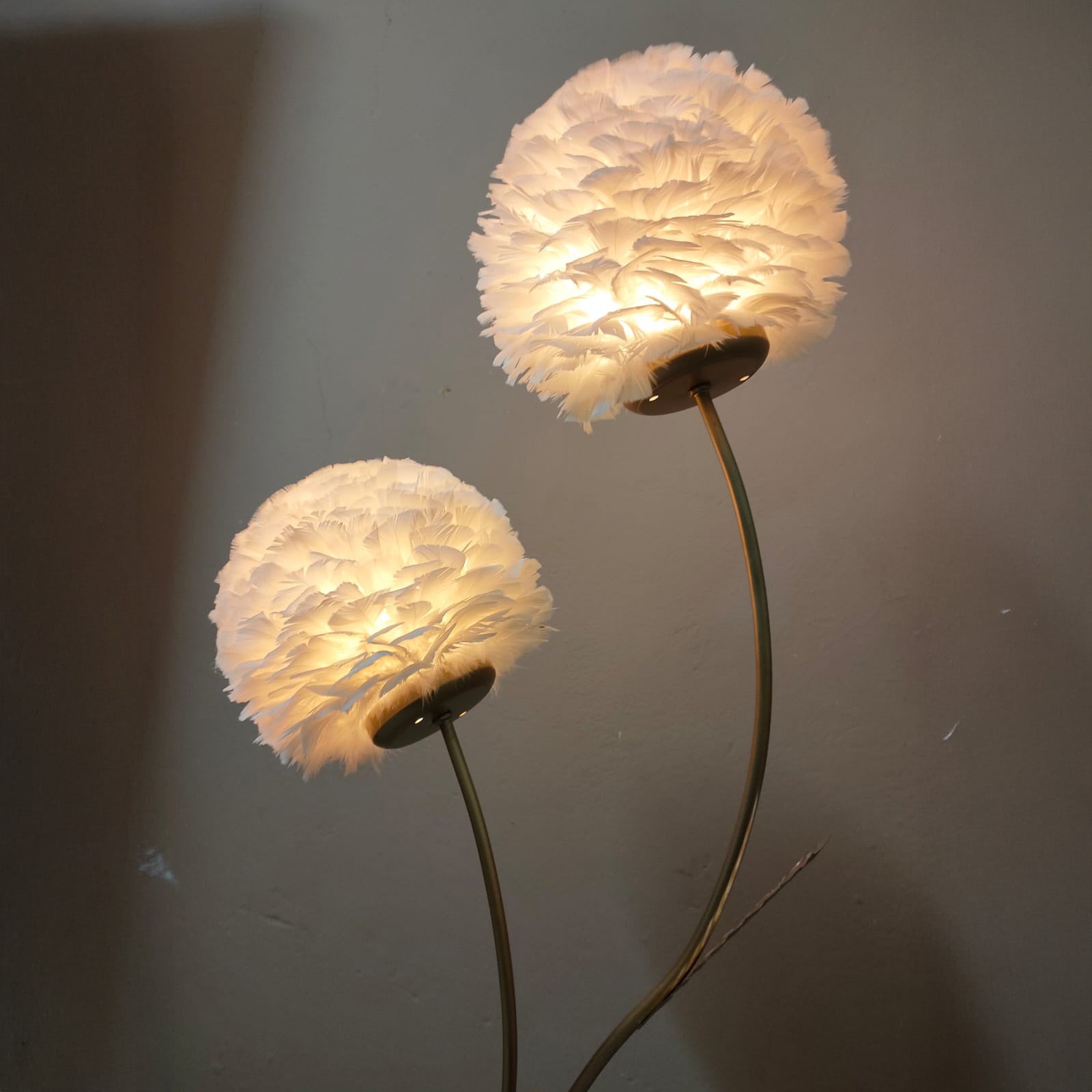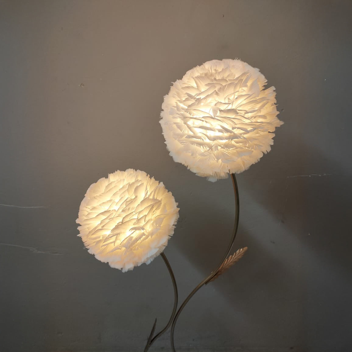 اضف لمسة من الفخامة والرقي إلى منزلك مع أباجورة الريش الأرضية. تصميمها المستوحى من الطبيعة مع قاعدة أنيقة تمنح المكان حضورًا ملكيًا، بينما تضيف الريشات البيضاء الفاخرة إضاءة دافئة ومبهجة لتصنع أجواءً حالمة في غرفة المعيشة أو غرفة النوم.