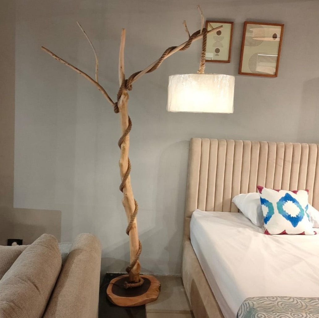 هذه الأباجورة الأرضية ليست مجرد مصدر إضاءة، بل قطعة فنية مصنوعة من الخشب الطبيعي لتضفي على المكان روحًا هادئة وأنيقة. تصميمها المستوحى من شكل الشجرة مع الحبل الملفوف يمنحها لمسة عصرية تناسب مختلف المساحات.