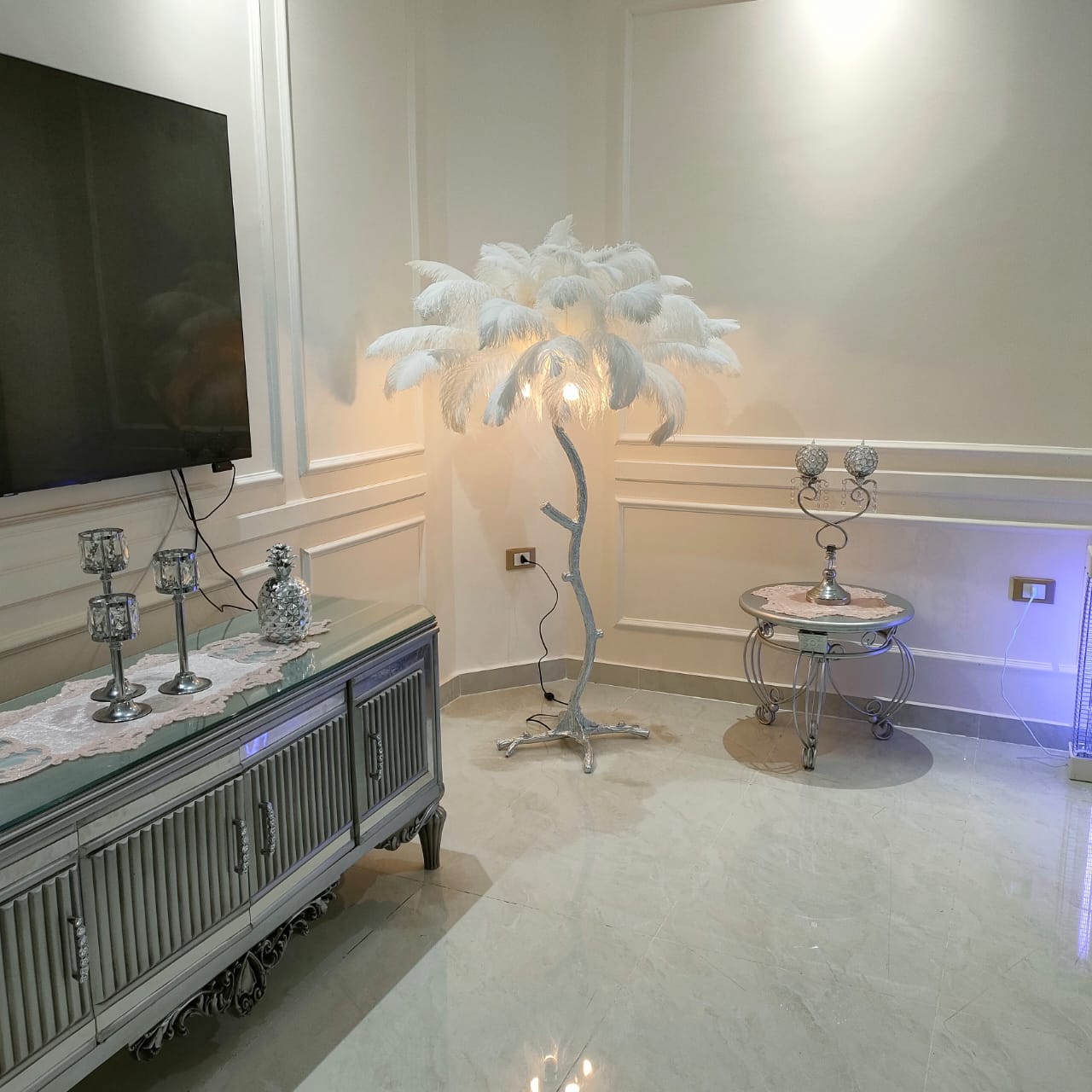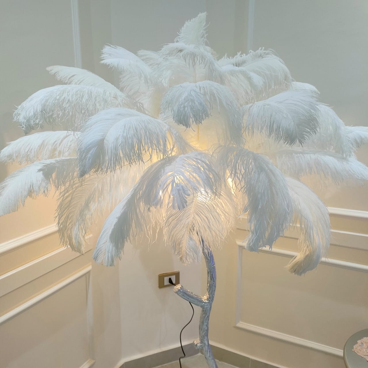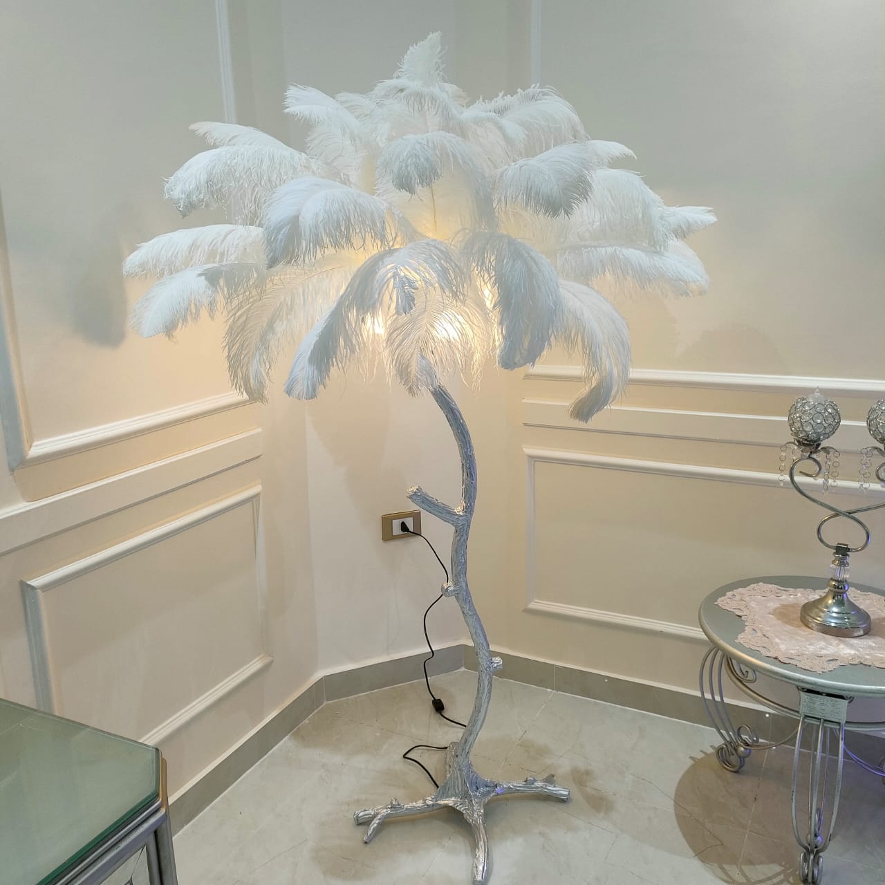اضف لمسة من الفخامة والرقي إلى منزلك مع أباجورة الريش الأرضية. تصميمها المستوحى من الطبيعة مع قاعدة أنيقة تمنح المكان حضورًا ملكيًا، بينما تضيف الريشات البيضاء الفاخرة إضاءة دافئة ومبهجة لتصنع أجواءً حالمة في غرفة المعيشة أو غرفة النوم.