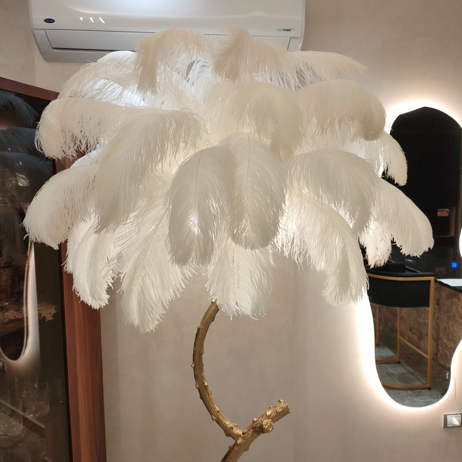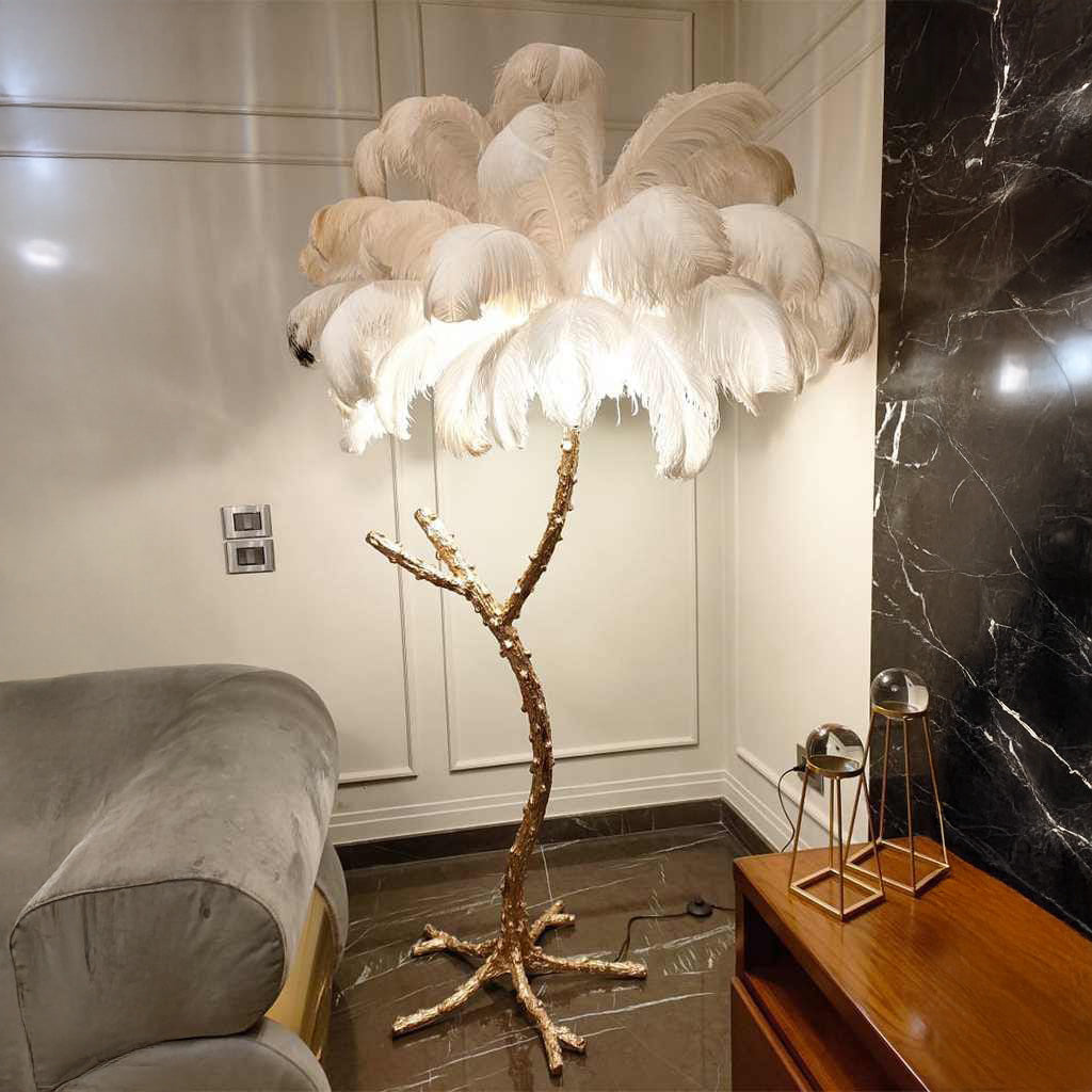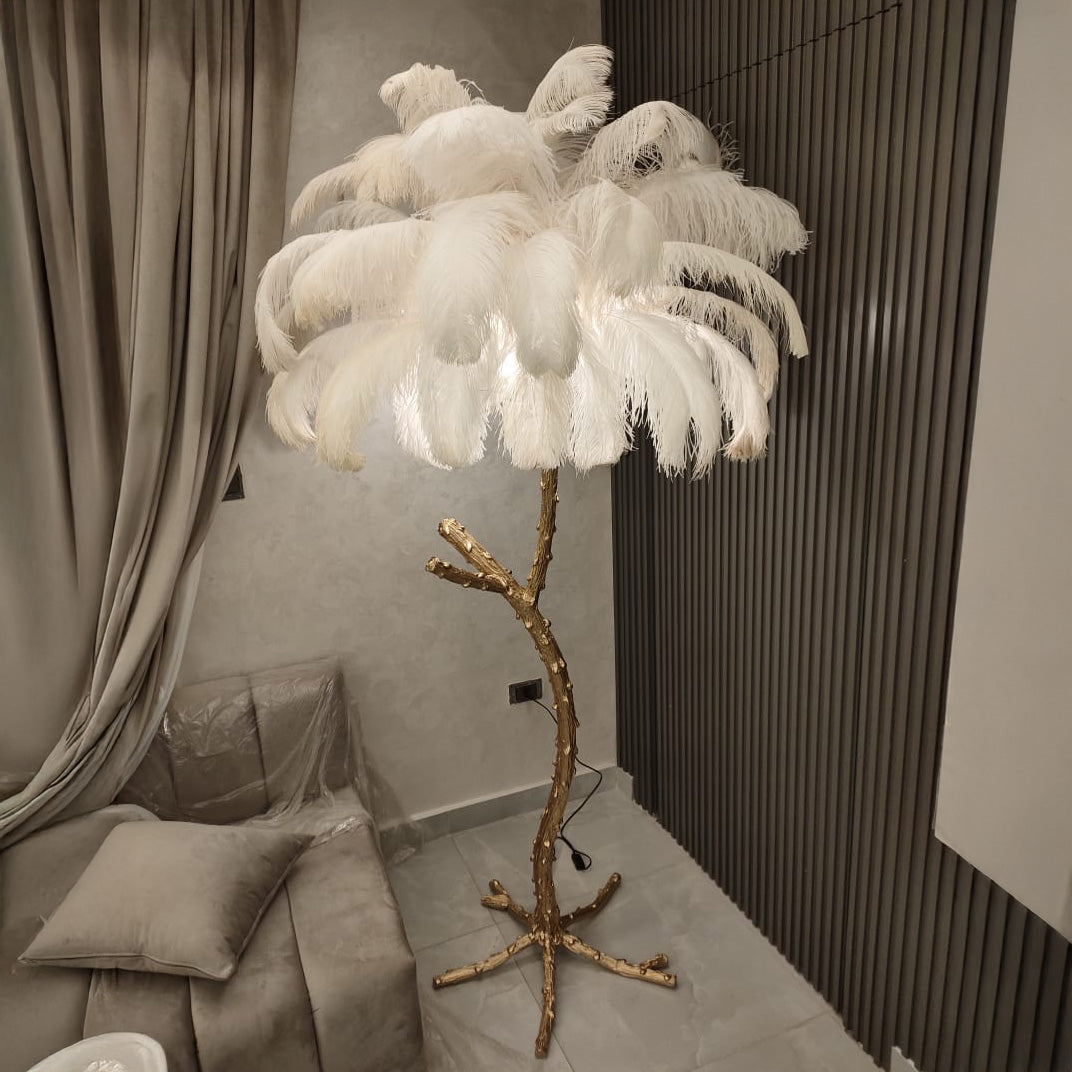 اضف لمسة من الفخامة والرقي إلى منزلك مع أباجورة الريش الأرضية. تصميمها المستوحى من الطبيعة مع قاعدة أنيقة تمنح المكان حضورًا ملكيًا، بينما تضيف الريشات البيضاء الفاخرة إضاءة دافئة ومبهجة لتصنع أجواءً حالمة في غرفة المعيشة أو غرفة النوم.