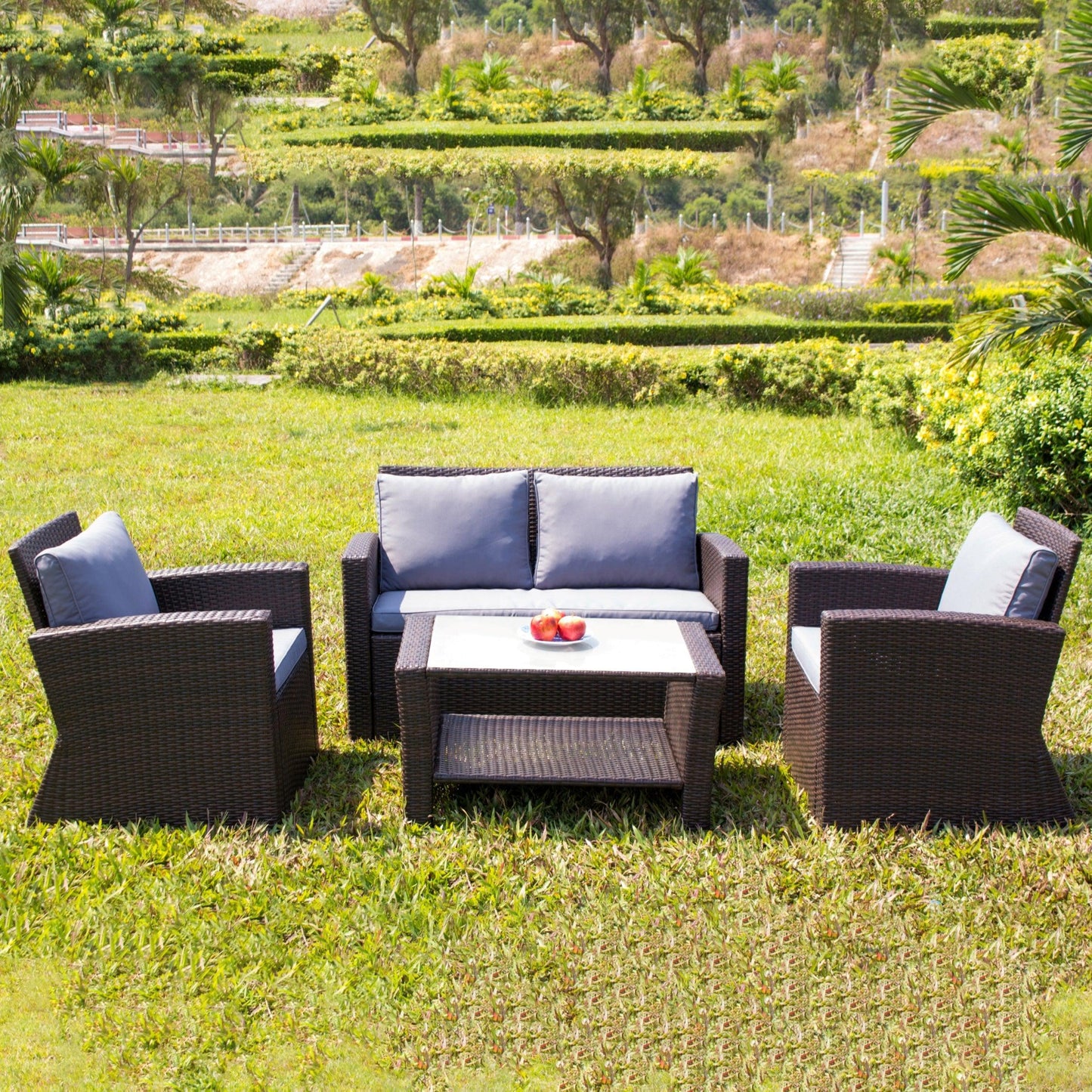 اختر طقم مكون من كنبة وكرسيين وترابيزة اذا كنت تبحث عن الإسترخاء وخلق جو خاص بيك في المنزل، فإليك هذا الطقم الرائع، ضعه في حديقة منزلك فهو مقاومة للعوامل الجوية والشمس